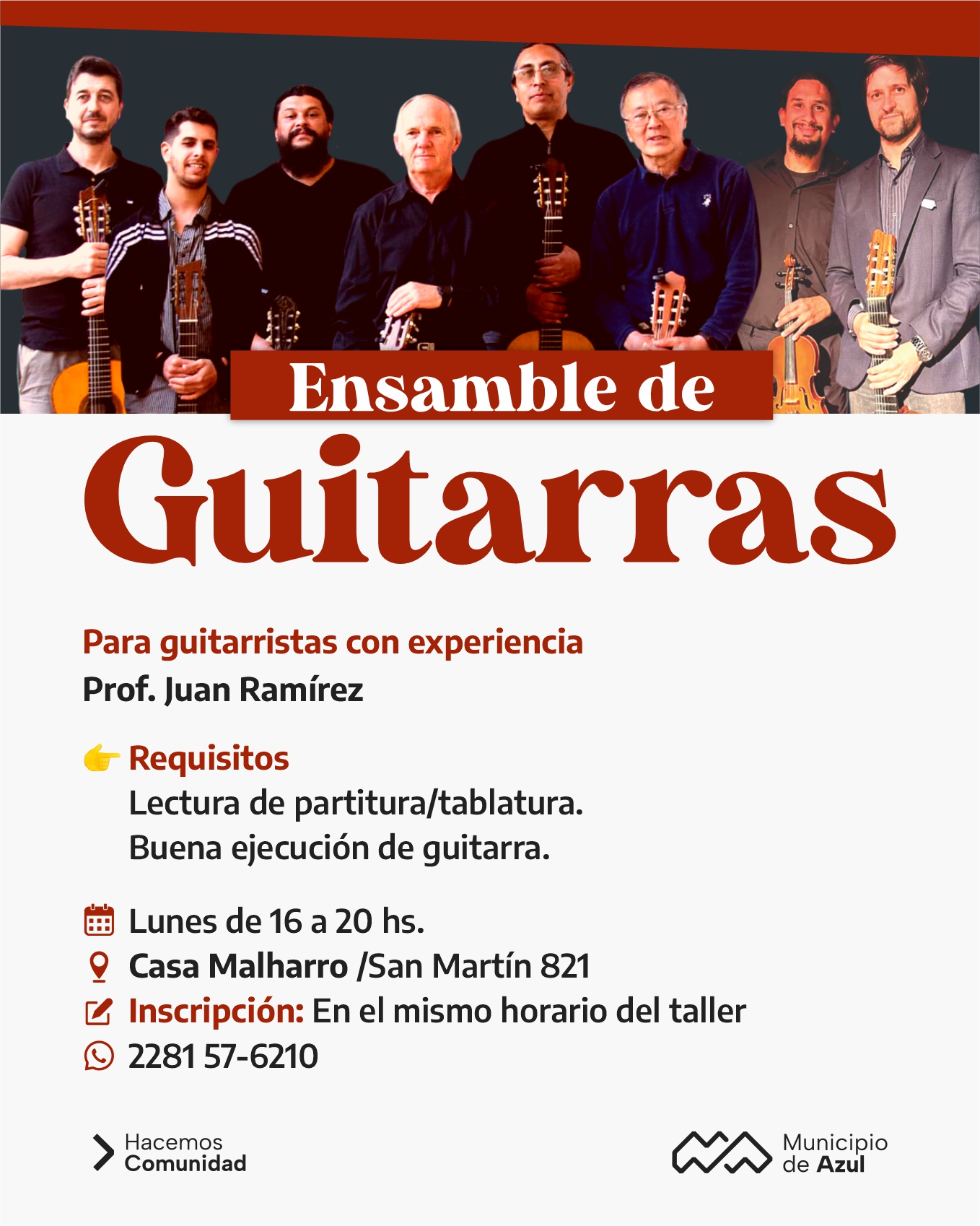 El Municipio de Azul informa que se encuentra abierta la inscripción para el Taller de Guitarra para jóvenes y adultos a cargo del docente Juan Ramírez, que se dictará en Casa Malharro – San Martín 821- los miércoles de 16 a 20.