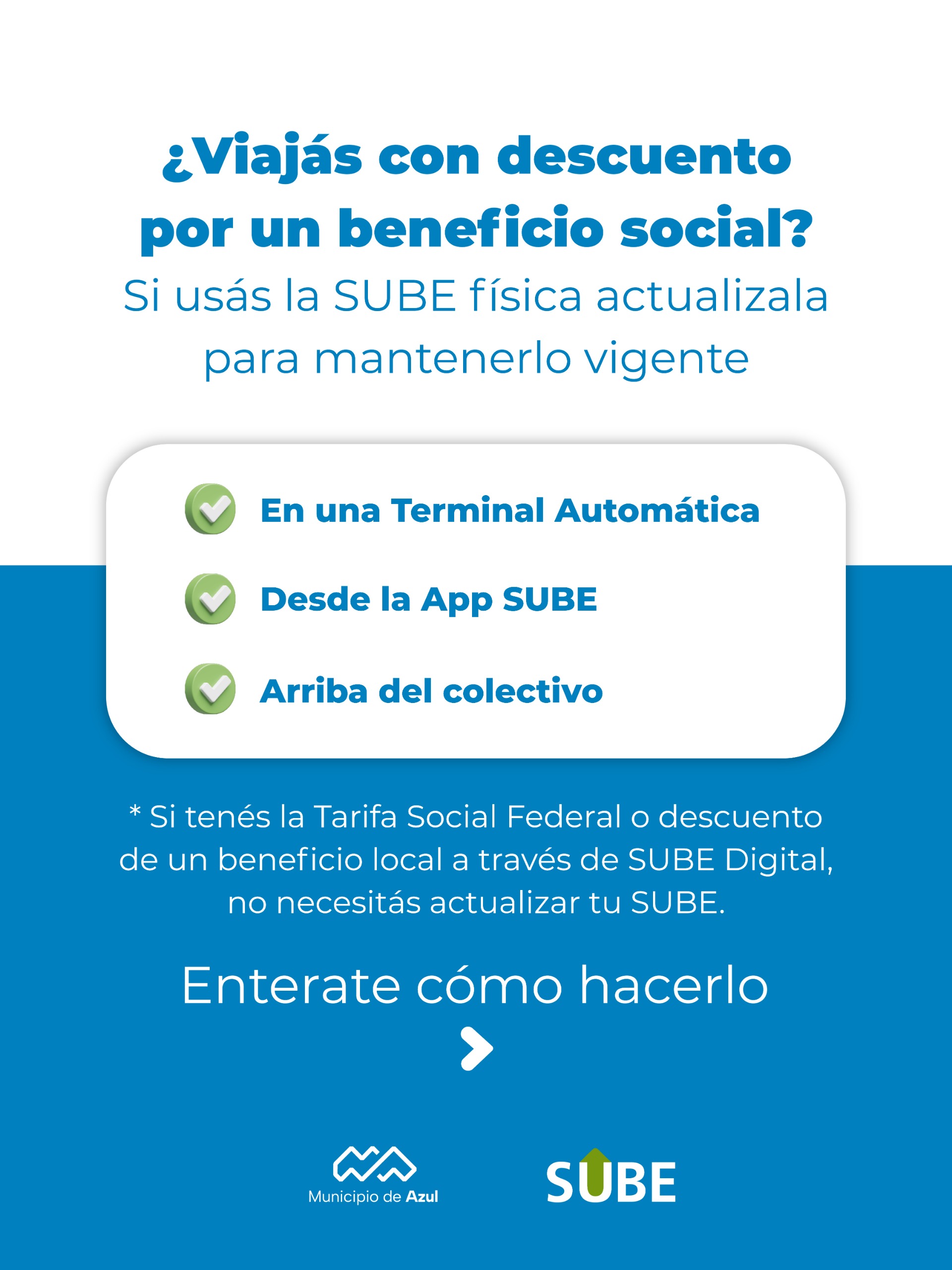 Además, el trámite podrá hacerse en cualquiera de las terminales automáticas -Terminal de Ómnibus, comedor de la UNICEN o Avda. 25 de Mayo Nº619-, allí se deberá apoyar la SUBE unos segundos hasta que el equipo indique que se la retire.