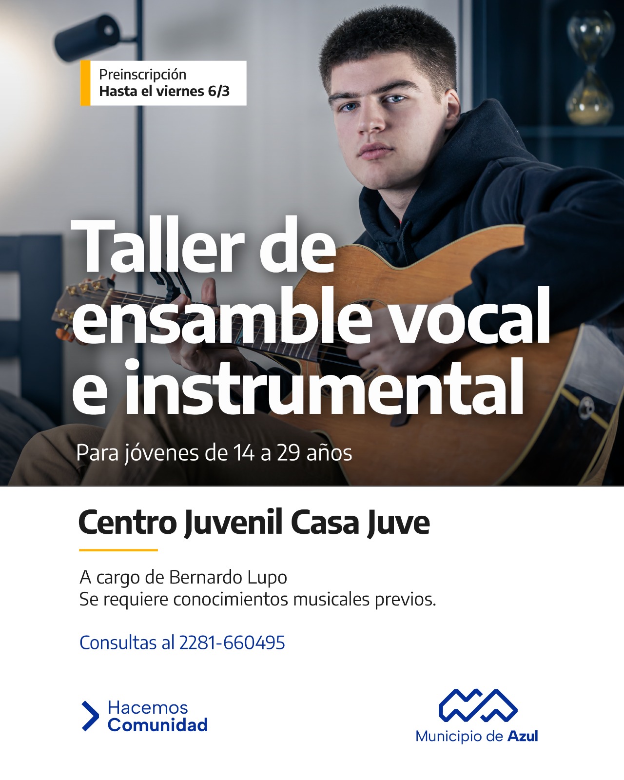 El Municipio de Azul informa que aún quedan algunas vacantes para el Taller de ensamble vocal e instrumental que se dictará en el Centro Juvenil “Casa Juve”.