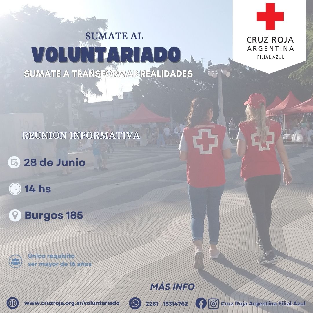 La Cruz Roja es un movimiento de socorro voluntario y de carácter desinteresado. Según su marco normativo cualquier persona que así lo desee puede sumarse a su equipo de voluntarios y voluntarias, siempre y cuando sea mayor de 16 años. Para inscripciones, podrán hacerlo en la web: www.cruzroja.org.ar/voluntariado seleccionando “filial azul” Para más información puede comunicarse al WhatsApp 02281314762 o en redes sociales a “Cruz Roja Argentina filial Azul”.