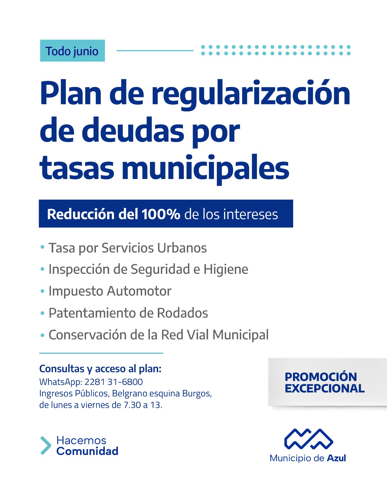Los interesados en acceder al plan especial deberán acercarse a la Oficina de Ingresos Públicos, Belgrano esquina Burgos, de lunes a viernes de 7:30 a 13. Por consultas podrán comunicarse vía WhatsApp a la línea (2281) 316800.