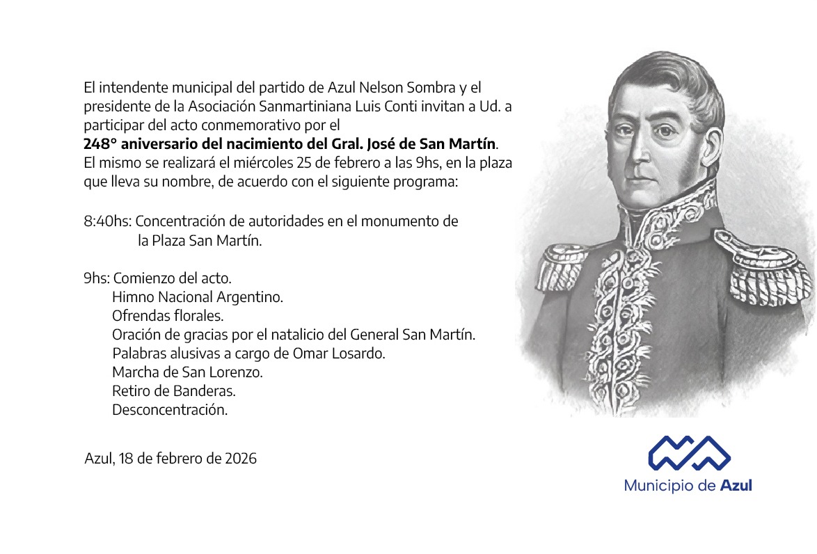 El Municipio de Azul invita a la comunidad a participar este miércoles 25 del acto conmemorativo por el 248° aniversario del nacimiento del General José de San Martín. El mismo será presidido por el intendente Nelson Sombra junto al presidente de la Asociación Sanmartiniana Luis Conti.