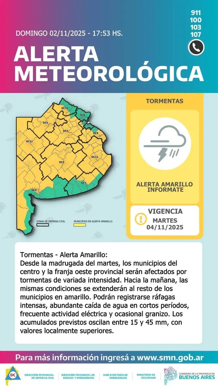 Hacia la mañana, podrán registrarse ráfagas intensas, abundante caída de agua en cortos períodos, frecuente actividad eléctrica y ocasional granizo. Los acumulados previstos oscilan entre 15 y 45 mm, con valores localmente superiores.