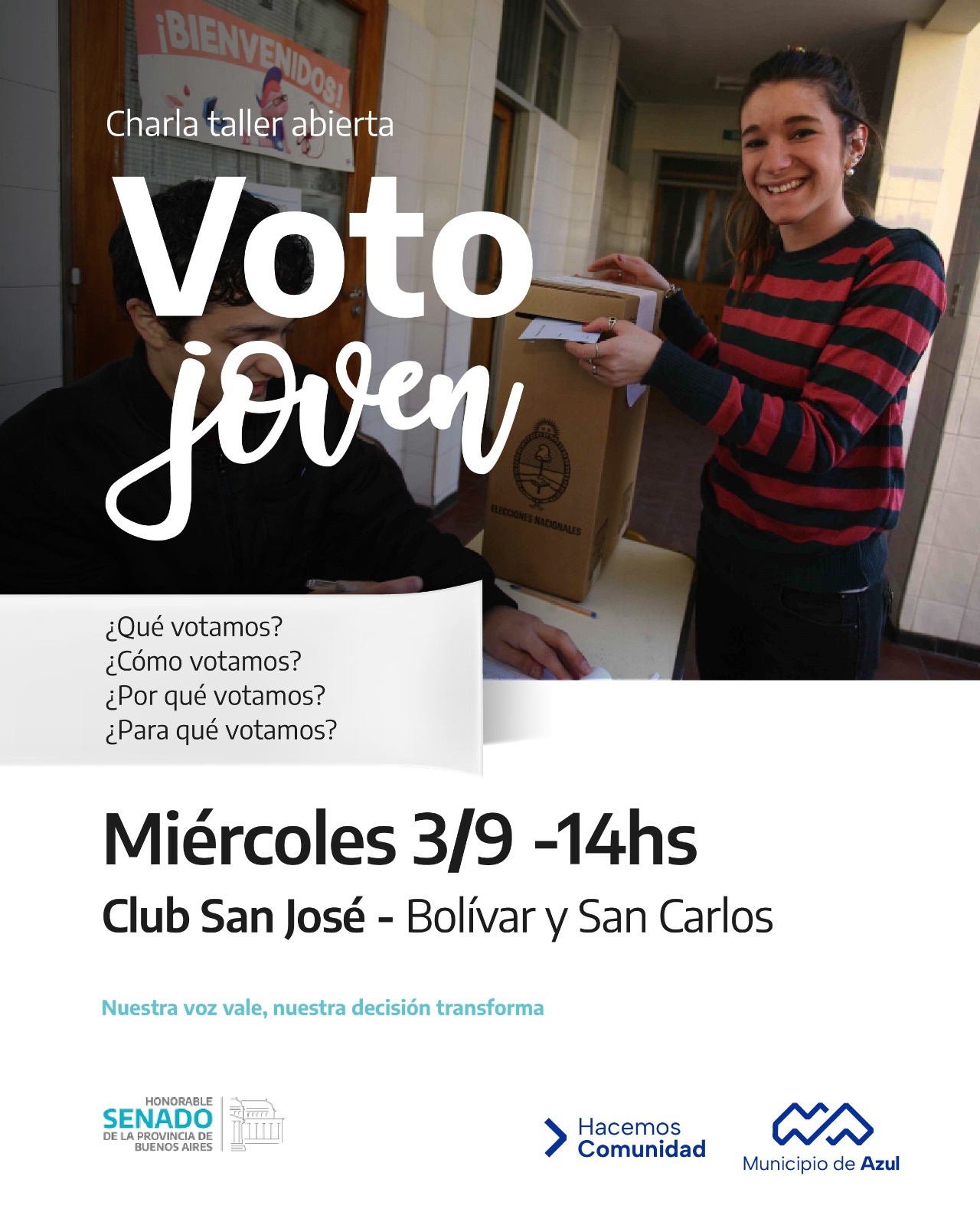 La actividad se desarrolla en articulación con la Dirección de Políticas Sociales Integrales del Senado de la Provincia y tiene como objetivo central fortalecer la convicción de las y los jóvenes de ejercer el derecho y el deber de votar. Se trata de una instancia de encuentro, escucha y participación donde las juventudes puedan debatir, proponer y generar colectivamente ideas y acciones que afiancen y defiendan sus derechos.