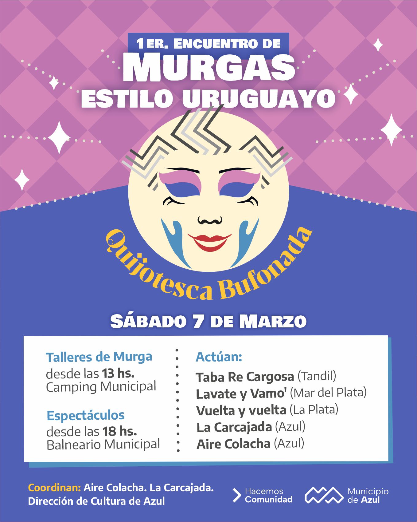 El Municipio de Azul informa que el sábado 7 de marzo, en el Balneario Municipal, se realizará el Primer Encuentro de Murgas 2026 “Quijotesca Bufonada", en el que también habrá foodtrucks y artesanos.