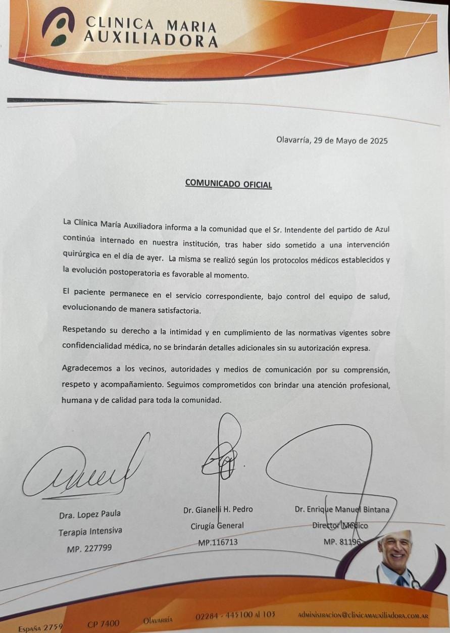 Desde la Clínica María Auxiliadora de Olavarría se brindó un parte de prensa sobre el estado de salud del intendente Nelson Sombra.