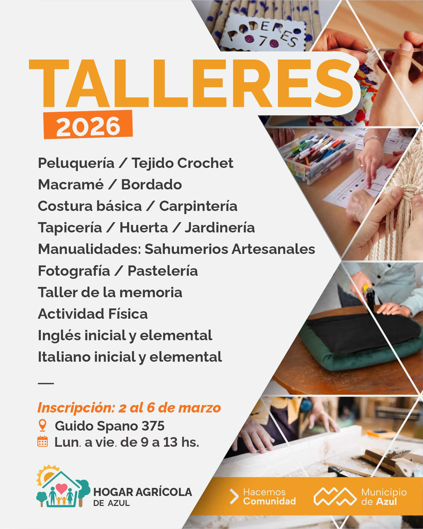 El Municipio de Azul informa que desde el lunes 2 y hasta el viernes 6 de marzo estará abierta la inscripción para los talleres que brindará el Hogar Agrícola en este ciclo lectivo.