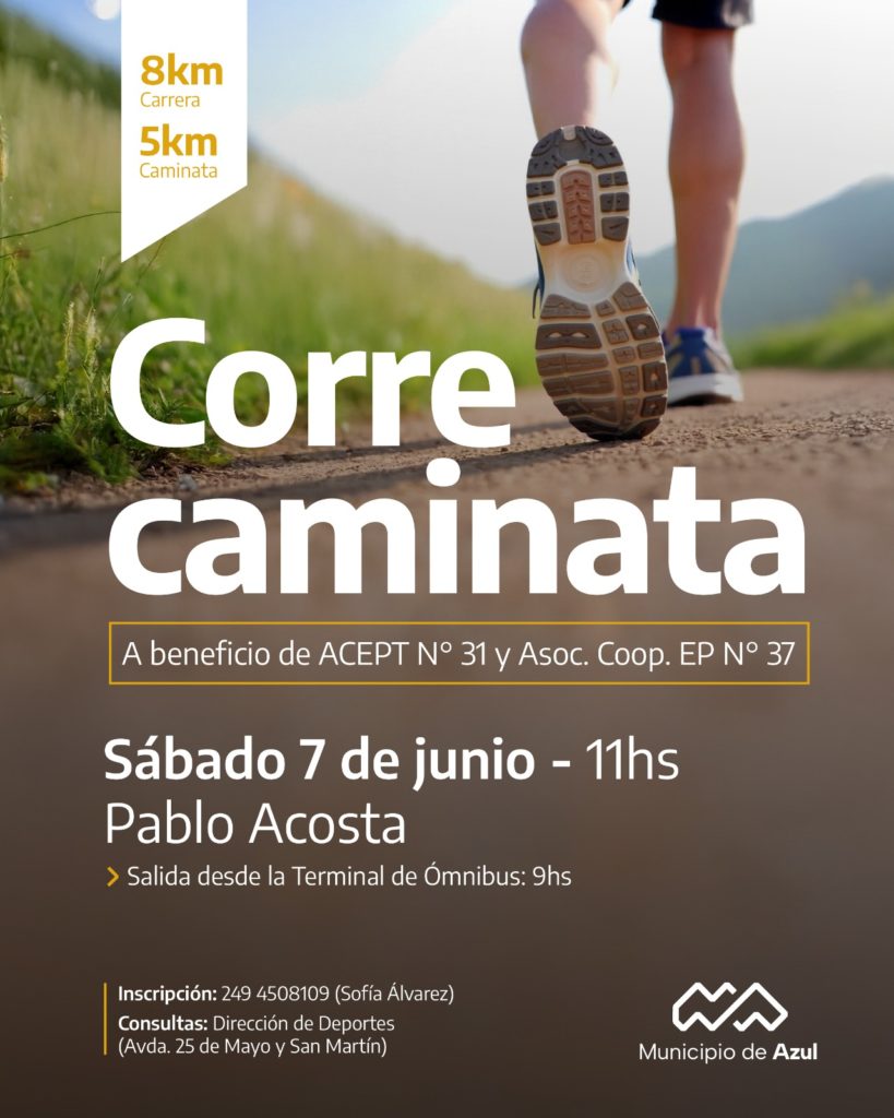 El Municipio de Azul informa que el sábado 7 de junio a las 11 en el Paraje Pablo Acosta, se realizará una correcaminata a beneficio de la Asociación del Centro Educativo para la Producción Total (ACEPT) Nº 31 y la Asociación Cooperadora de la Escuela Primaria N°37.
