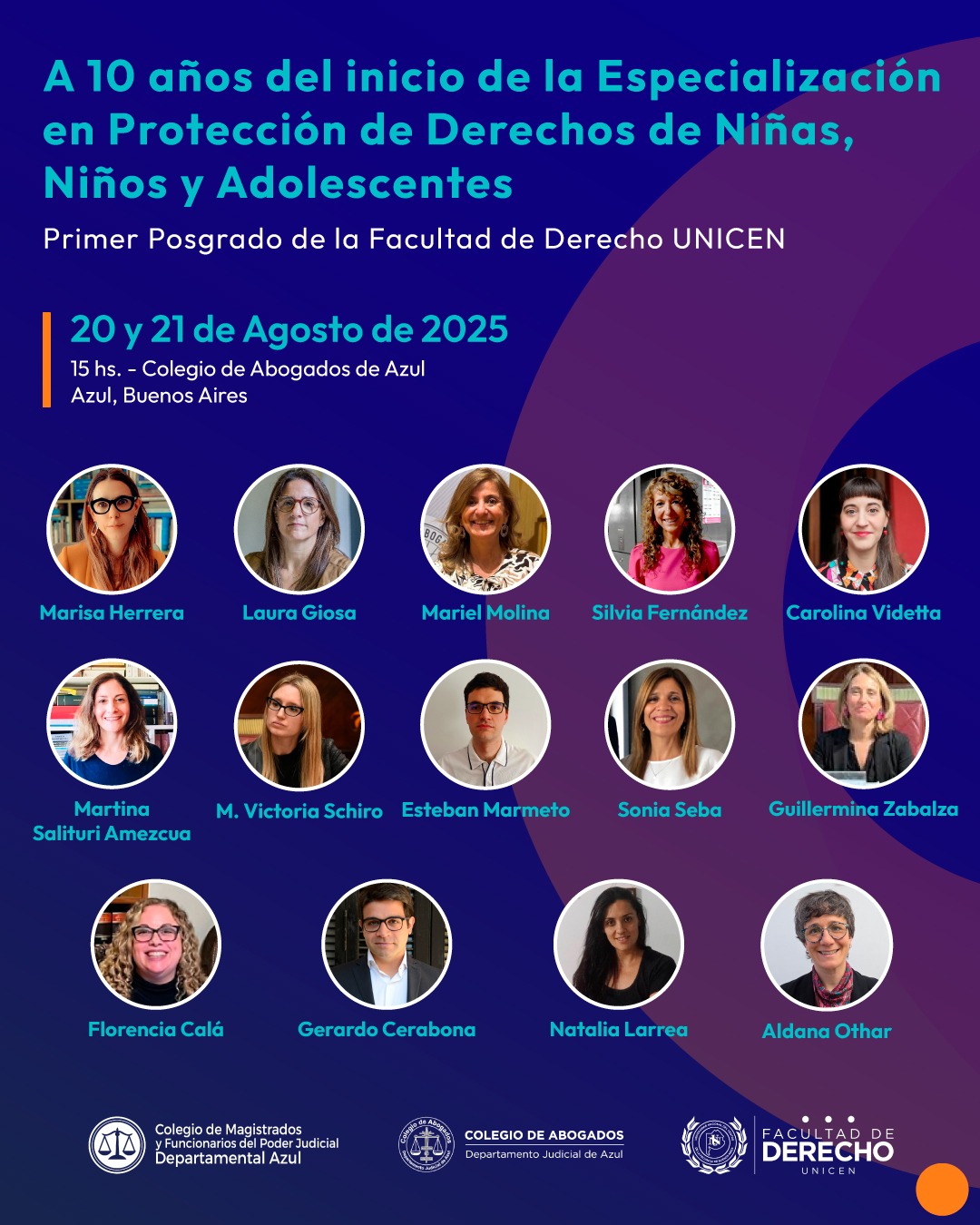15:00 hs. Bienvenida y apertura: Laura Giosa, Codirectora de la Especialización; Fernanda Giménez, Presidenta del Colegio de Abogados de Azul y Pablo Quaranta, Presidente del Colegio de Magistrados y Funcionarios Departamental Azul.