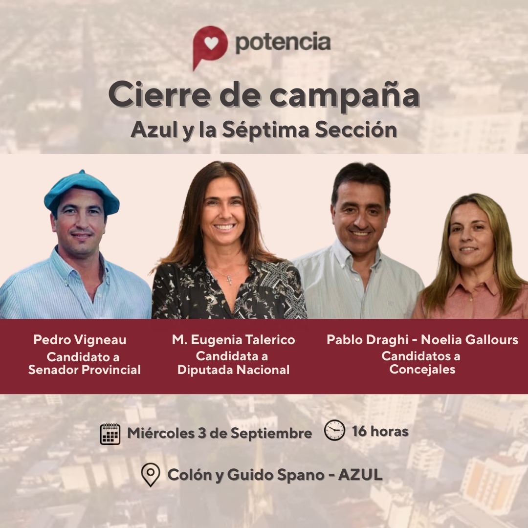 Participarán M. Eugenia Talerico, Candidata a Diputada Nacional, Pedro Vigneau, Candidato a Senador Provincial, Pablo Draghi y Noelia Gallours, Candidatos a Concejales.