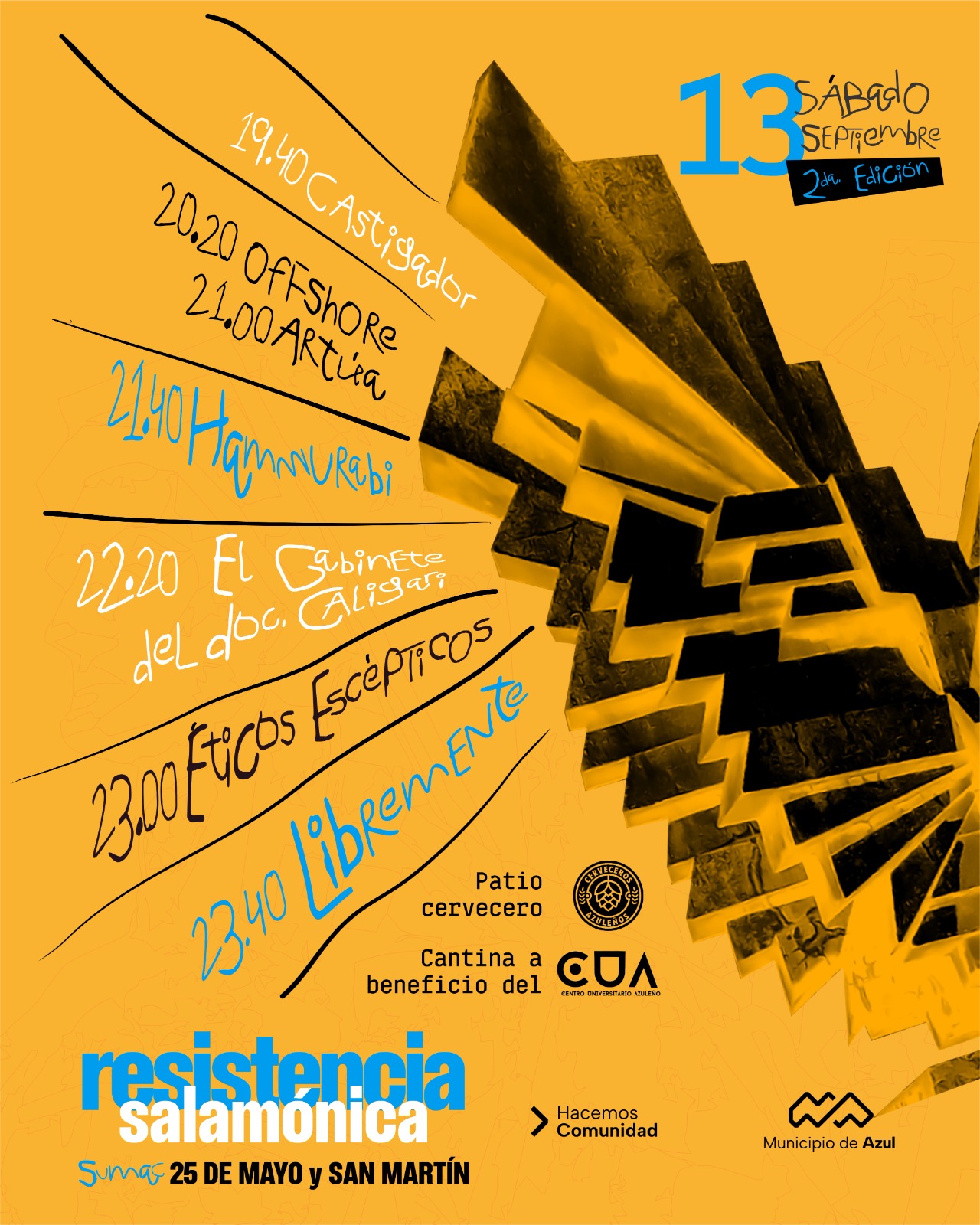 Durante la jornada se presentarán diferentes bandas locales de acuerdo al siguiente cronograma: 19:40 Castigador; 20:20 Offshore; 21:00 Artúa; 21:40 Hammurabi; 22:20 El gabinete del Doc. Caligari; 23:00 Éticos Escépticos y a las 23:40 Libremente.