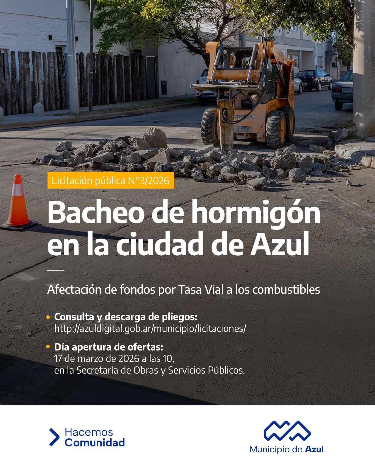 El Municipio de Azul informa que se encuentra abierta la licitación pública número 3 destinada al bacheo de hormigón en la ciudad de Azul. Asimismo, se abrió la convocatoria a proveedores –a través de la licitación privada número 1- para el bacheo asfáltico en caliente en la localidad. Ambas obras corresponden a la afectación de fondos por la Tasa Vial a los combustibles en el período 2026.