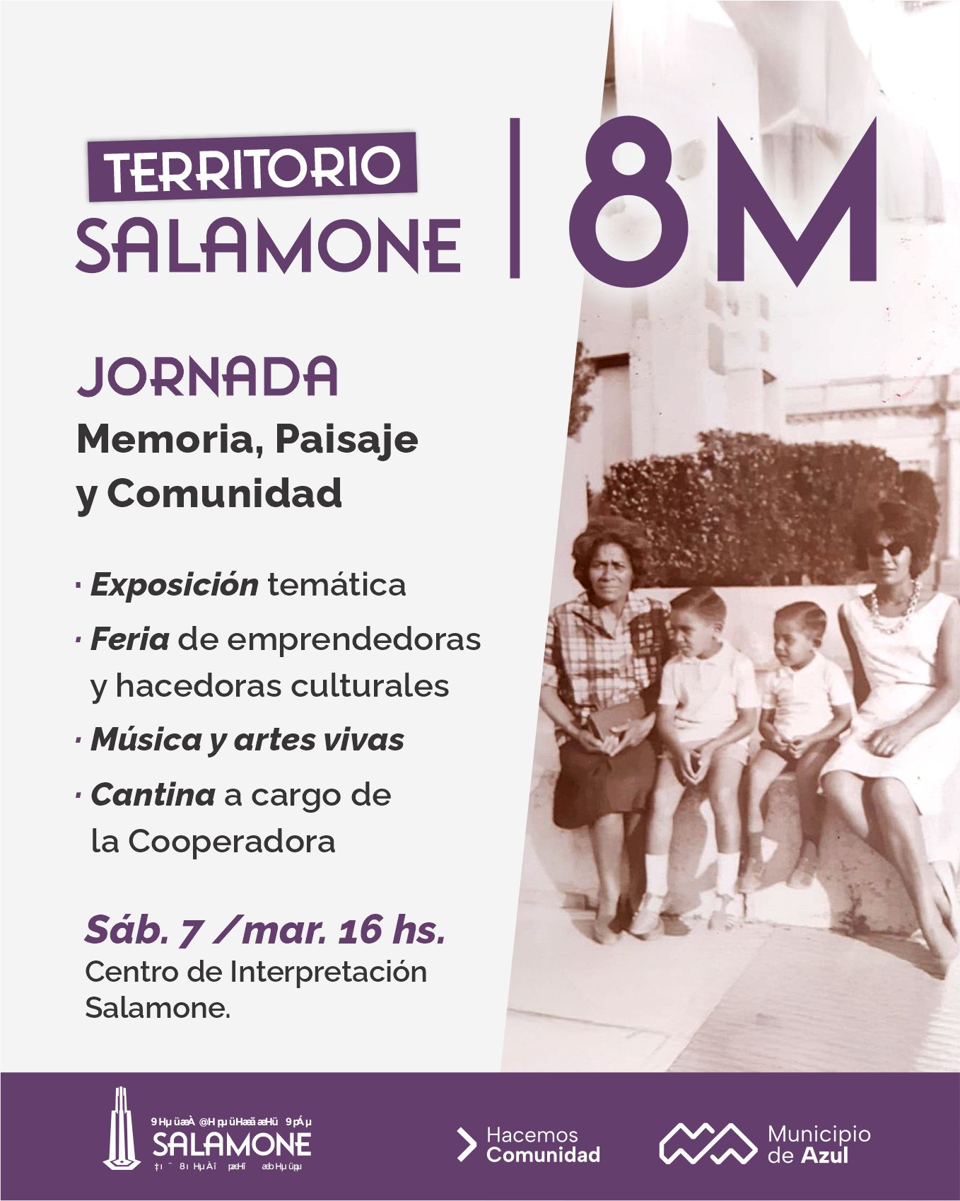 El Municipio de Azul informa que el sábado 7 de marzo, a partir de las 16, se realizará la jornada "Territorio Salamone / 8M: Memoria, Paisaje y Comunidad en Azul", en la sede del Centro de Interpretación Salamone, ubicado en Necochea entre Pasaje del Líbano y Lamadrid.