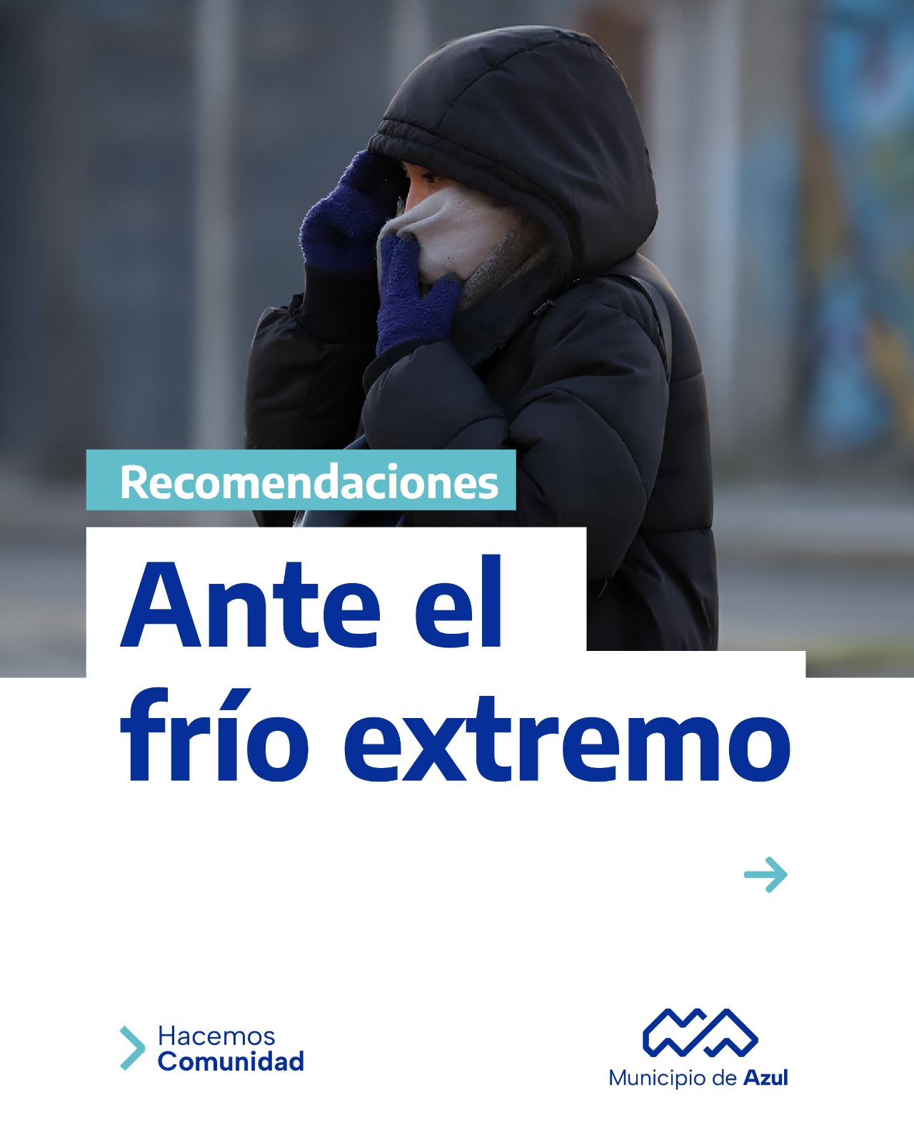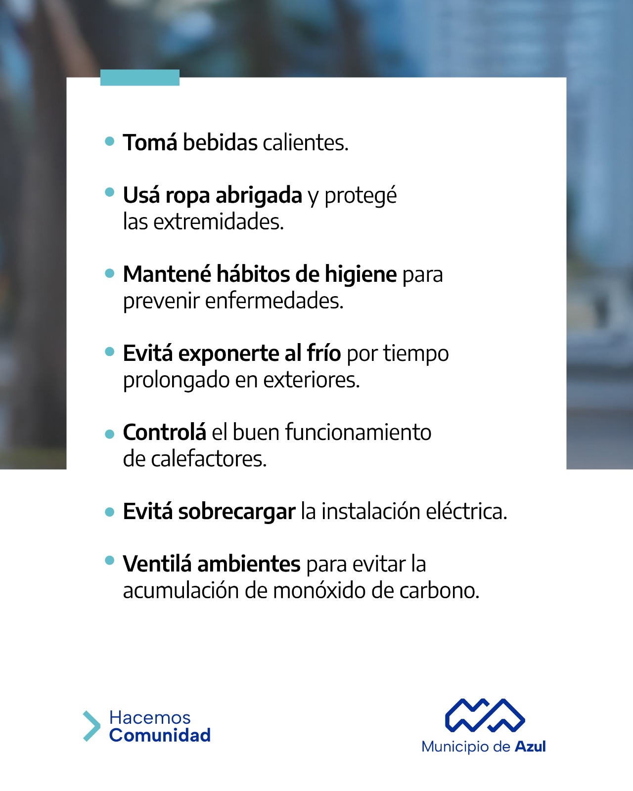 Recomienda tomar bebidas calientes para mantener el cuerpo a la temperatura adecuada; Usar ropa abrigada -adecuada para el frío- y proteger las extremidades; Mantener hábitos de higiene para prevenir enfermedades como la gripe y evitar el contacto con personas enfermas; No exponerse al frío por tiempo prolongado en exteriores; Controlar el buen funcionamiento de calefactores y no dejarlos encendidos sin supervisión; Evitar sobrecargar la instalación eléctrica; Ventilar ambientes para evitar la acumulación de monóxido de carbono y Proteger también a las mascotas.