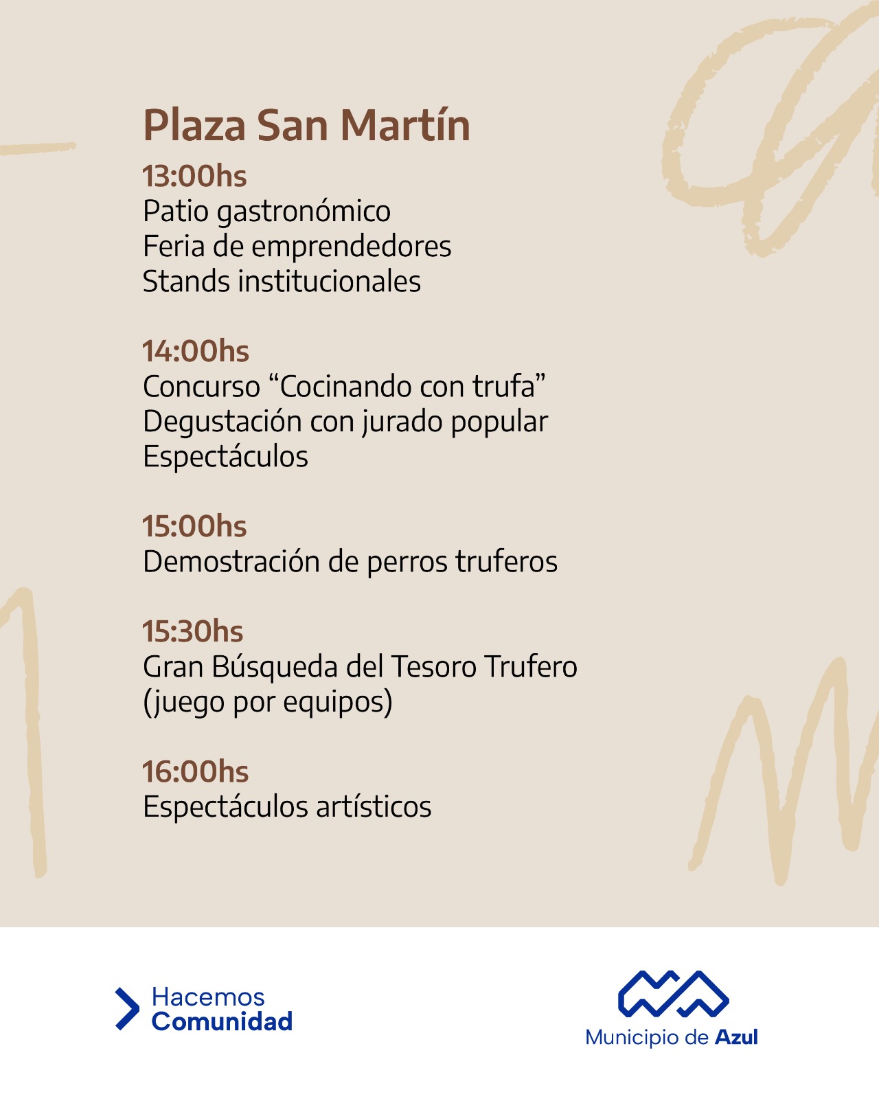 A las 14: concurso “Cocinando con trufa”: cocineros locales prepararán platos con trufas. Degustación a cargo de un jurado popular; espectáculos artísticos.
