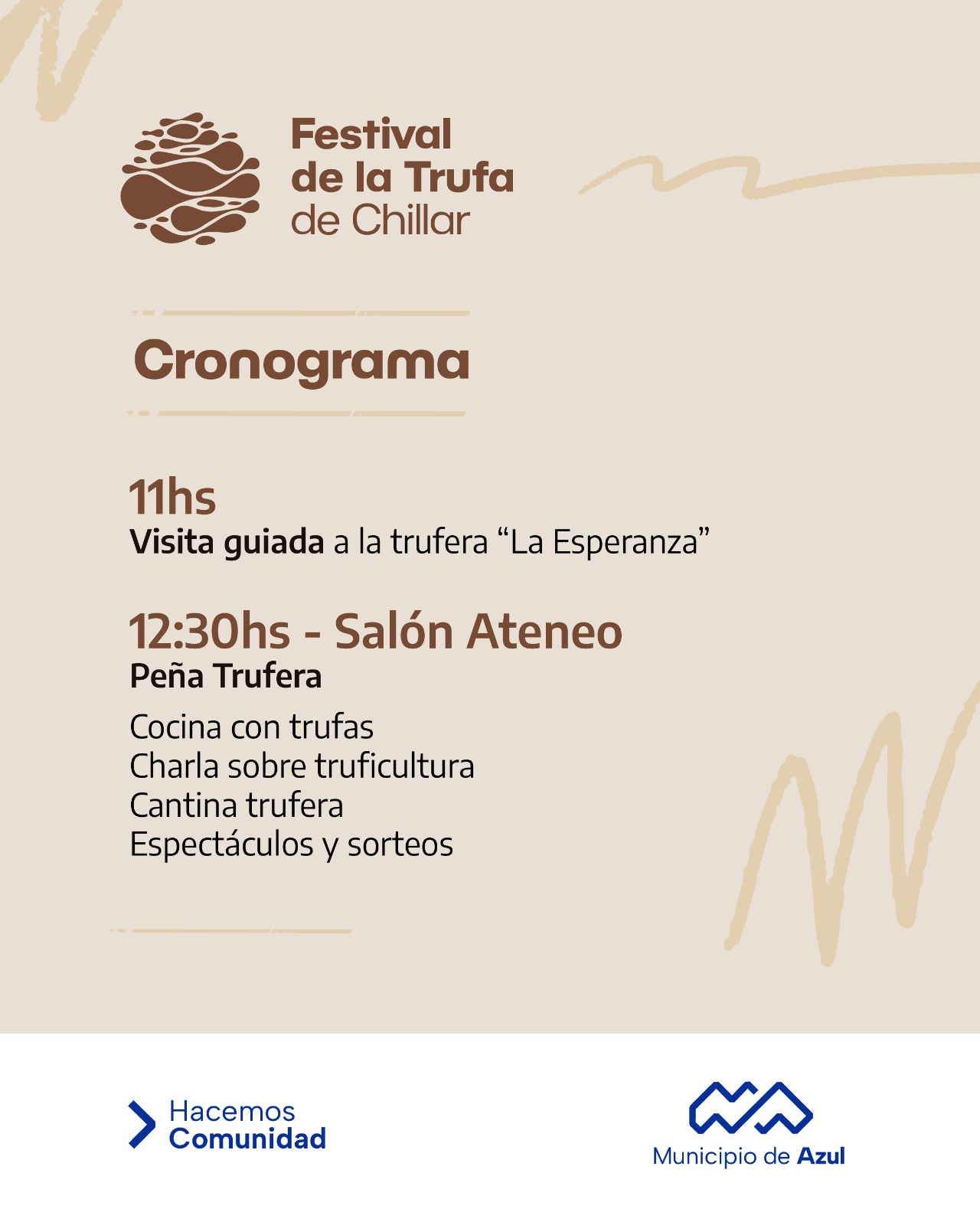 El cronograma previsto para esta primera edición del evento: a las 11, en el establecimiento “La Esperanza”, se realizará una visita guiada a la trufera; A las 12:30, en el Salón Ateneo: Peña trufera con masterclass de cocina con trufas y charla sobre truficultura (transmisión en vivo); cantina trufera. Risotto de trufas como menú especial; espectáculos artísticos y sorteos.